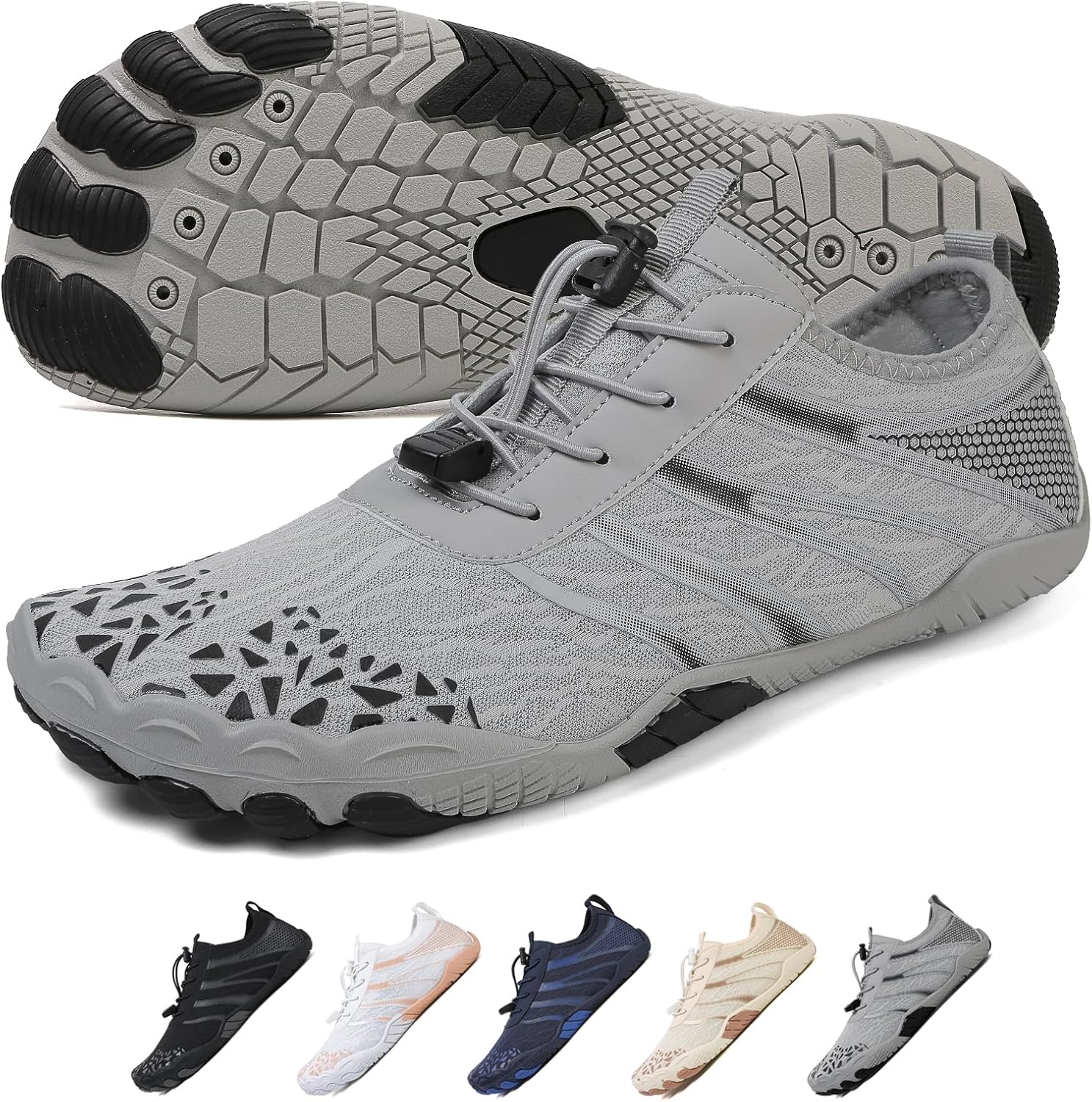- Unique Five-Toes Design: Featuring an anti-slip rubber sole with ergonomic cushioning and a separated protective toe guard, our barefoot shoes offer superior shock absorption and protection. At three times lighter than traditional shoes, they enhance running performance with an effortlessly light sensation. The upgraded elastic drawstring allows quick adjustments for a secure fit without the hassle of tying laces.